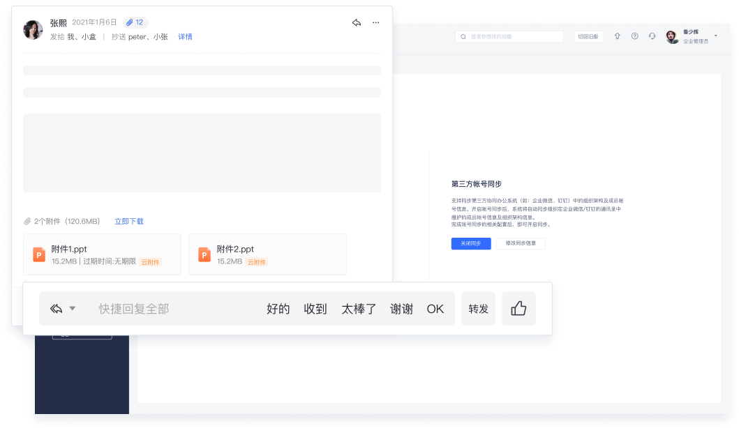 齐鲁医院将院方的第三方通信平台与网易企业邮箱深度集成,实现邮件实时提醒,网易企业邮箱帮助齐鲁医院制定个性化系统集成方案,满足了一体化办公需求。